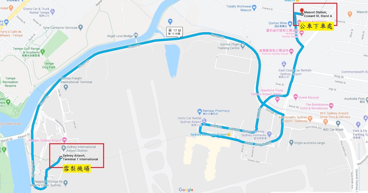 首先出機場大廳後往右手邊走,到對面的公車站,搭乘400號巴士(往Bondi Junction viaEastg方向),在Mascot Station Coward St,Stand A站下車(stop ID:2020113)