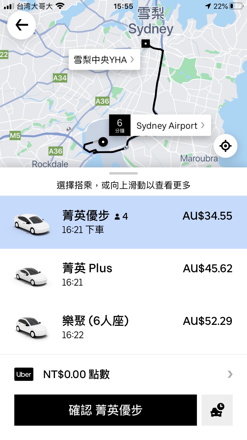 Uber還可以選擇4人座或6-7人座的車型喔!使用叫車軟體需要綁定信用卡才可使用喔!若是擔心車資過高,可事先使用叫車軟體選好路線,就會顯示預估的車資費用。